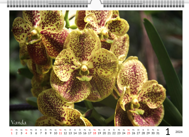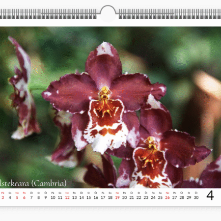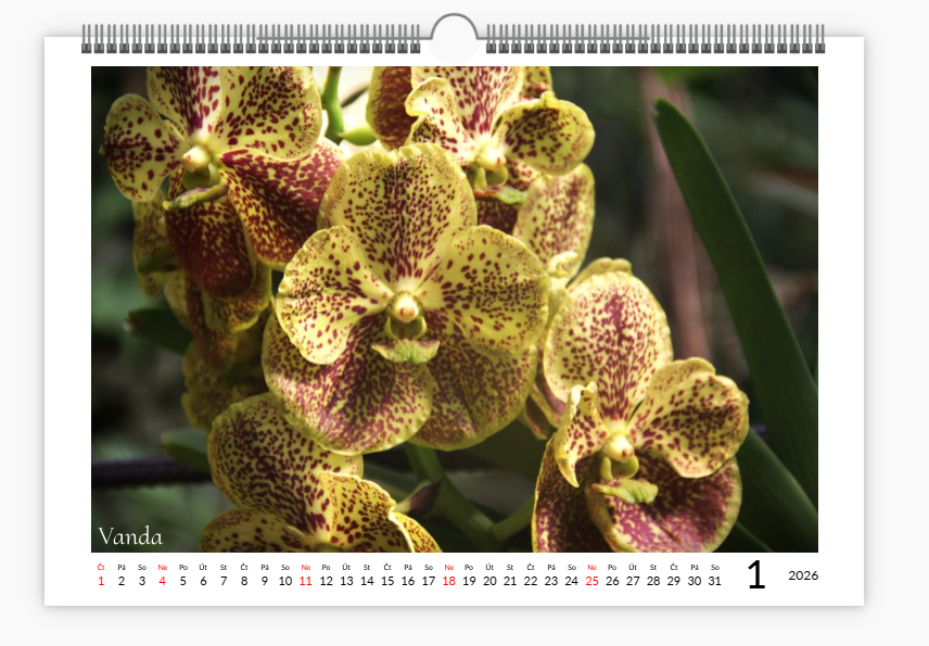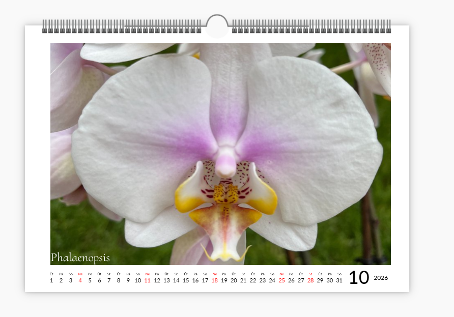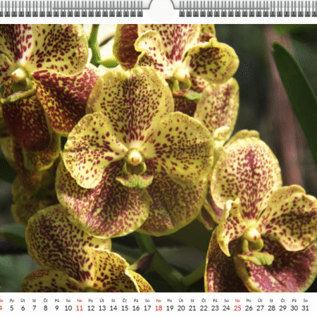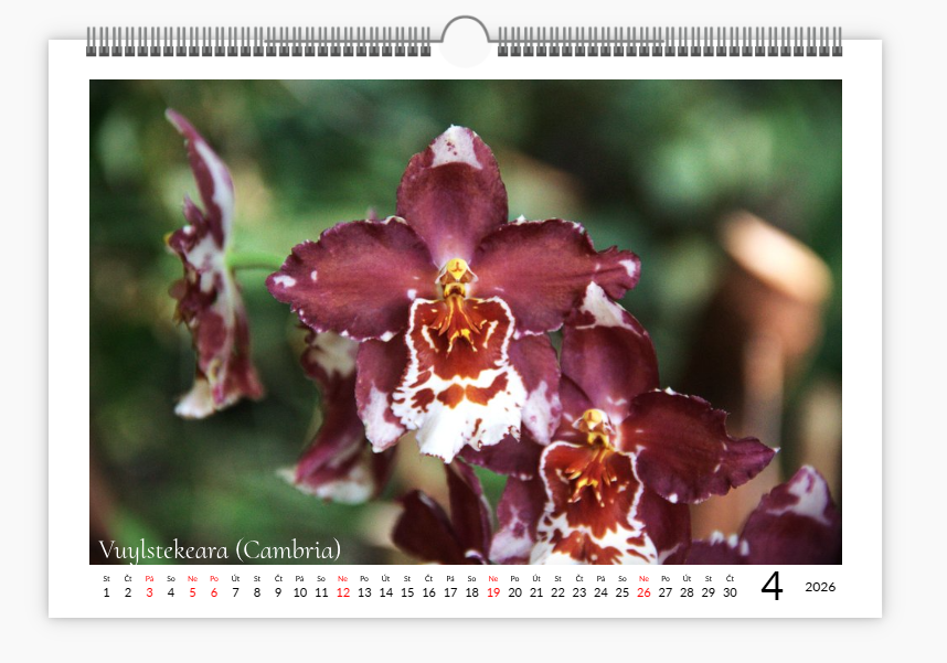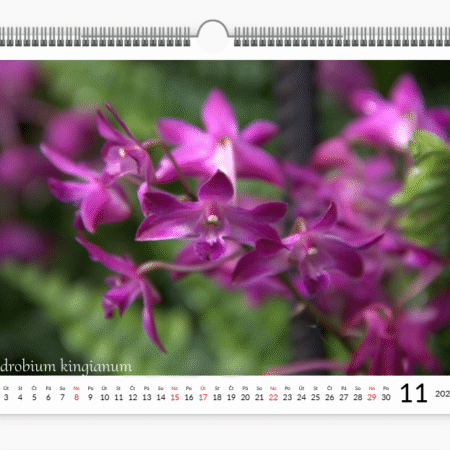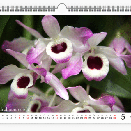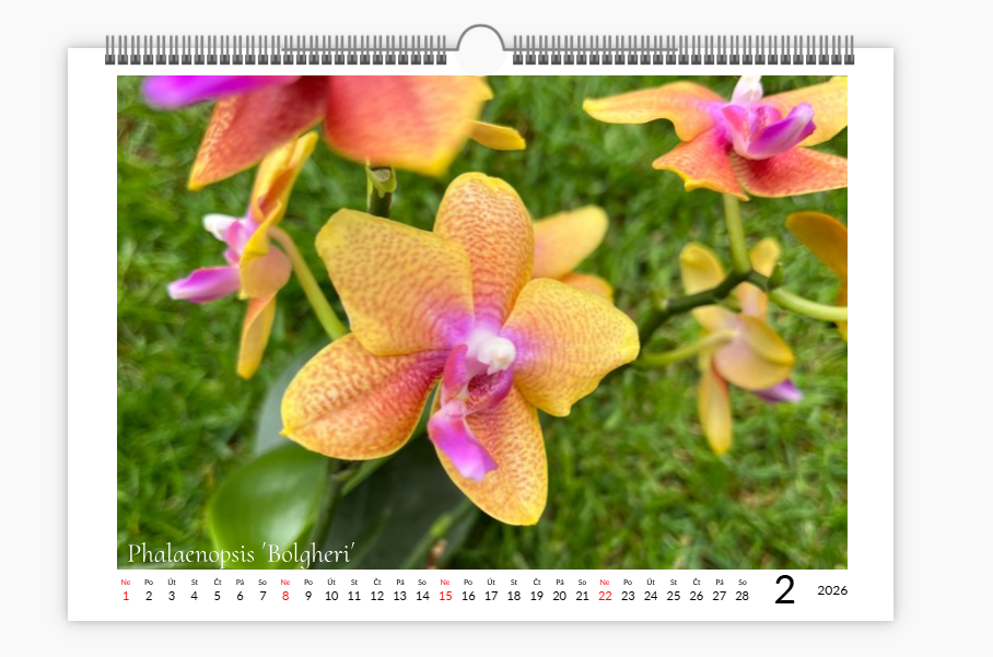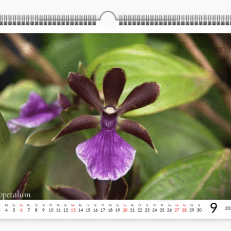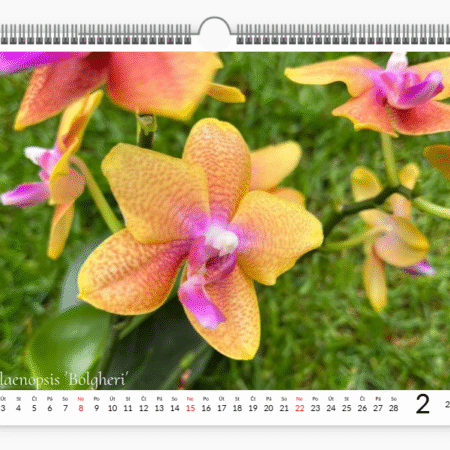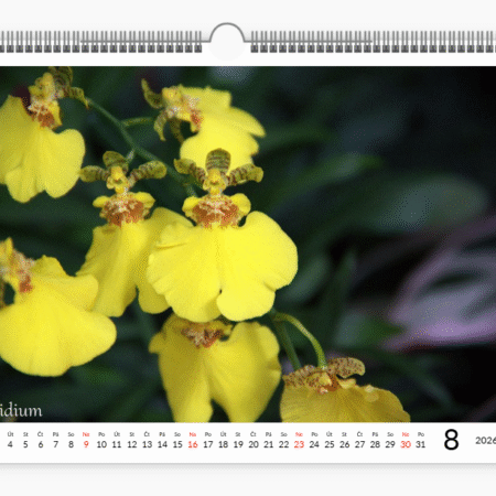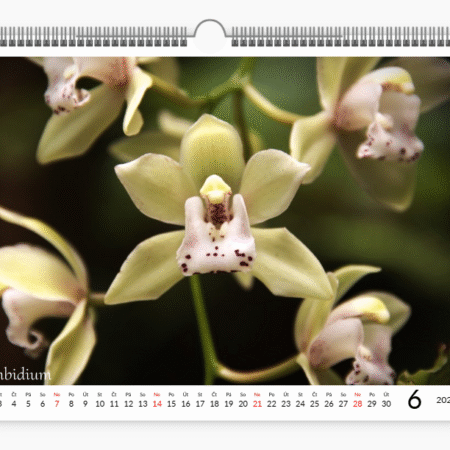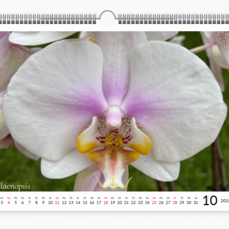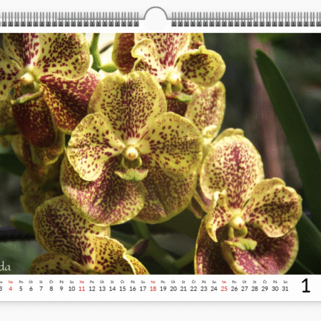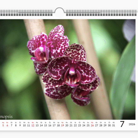 Objevte kouzlo orchidejí v originálním nástěnném kalendáři s autorskými fotografiemi. Každý měsíc vás potěší jiný druh či hybrid – od exotických Zygopetalum a Miltonií, přes něžné Phalaenopsis a Oncidia, až po elegantní Cymbidia či mezirodové křížence Cambrie. Fotografie jsem fotila v rodinné sbírce a na prestižní výstavě orchidejí ve skleníku Fata Morgana Botanické zahrady v Praze.